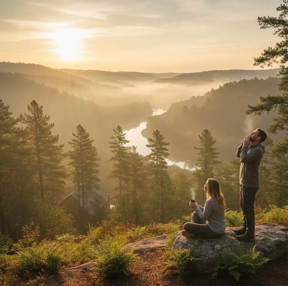 The first morning I woke up in Hochatown, the silence surprised me. No traffic noise, no city rush — just wind moving gently through tall pine trees. The fresh mountain air felt cooler and cleaner, especially at sunrise, and you can actually smell the forest around you. It’s the kind of place where you naturally slow down without even trying.